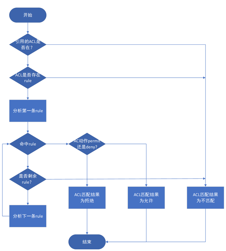 从整个ACL匹配流程可以看出,报文与ACL规则匹配后,会产生 “匹配”或者“不匹配”两个结果。