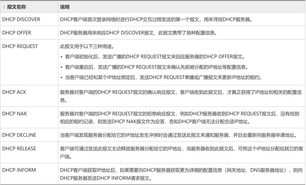 DHCP服务器与DHCP客户端之间通过DHCP报文进行通信。DHCP报文是基于UDP协议传输的。DHCP客户端向DHCP服务器发送报文时采用68端口号,DHCP服务器向DHCP客户端发送报文时采用67端口号。目前DHCP定义了如下八种类型报文。