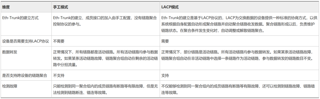 手工模式链路聚合和LACP模式链路聚合的区别如表1所示。